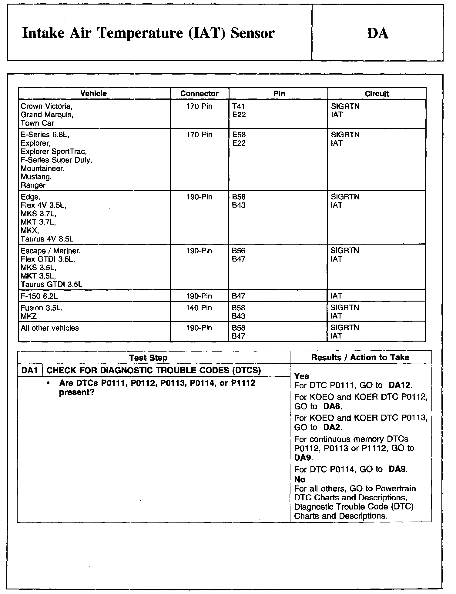 Home >> Ford >> 2010 >> Explorer AWD V8-4.6L >> Repair and Diagnosis >> Powertrain Management >> Computers and Control Systems >> Testing and Inspection >> Pinpoint Tests >> Test DA: Intake Air Temperature (IAT) Sensor