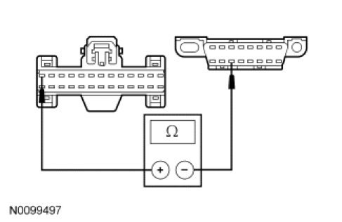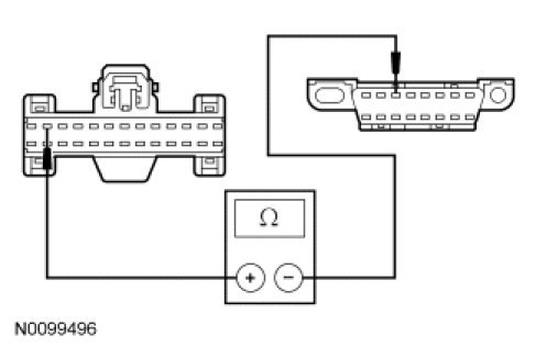 - Measure the resistance between the SJB C2280b-38, circuit VDB07 (VT/OG), harness side and the DLC C251-11, circuit VDB07 (VT/OG), harness side.