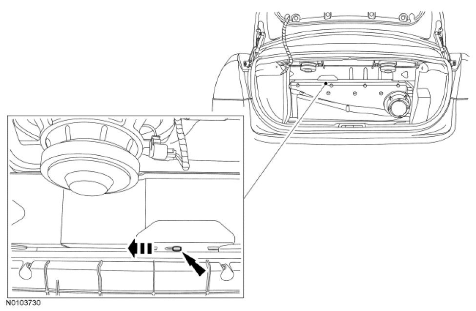 - Between the High Voltage Traction Battery (HVTB) and the sheet metal, locate the seat backrest latch release lever.