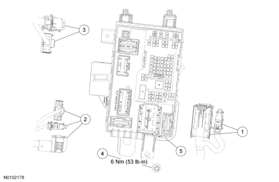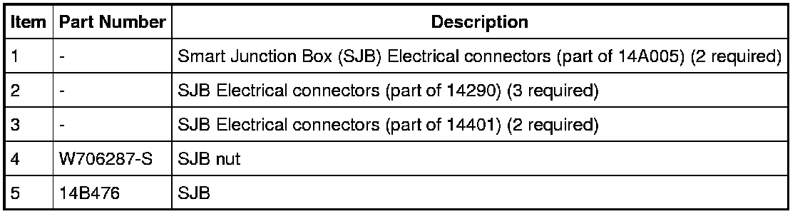 NOTE: Prior to the replacement of the module, it is necessary to upload the module configuration information to a scan tool. This information must be downloaded into the new Smart Junction Box (SJB) after installation. For additional information, refer to Information Bus to carry out Programmable Module Installation (PMI). Programming and Relearning