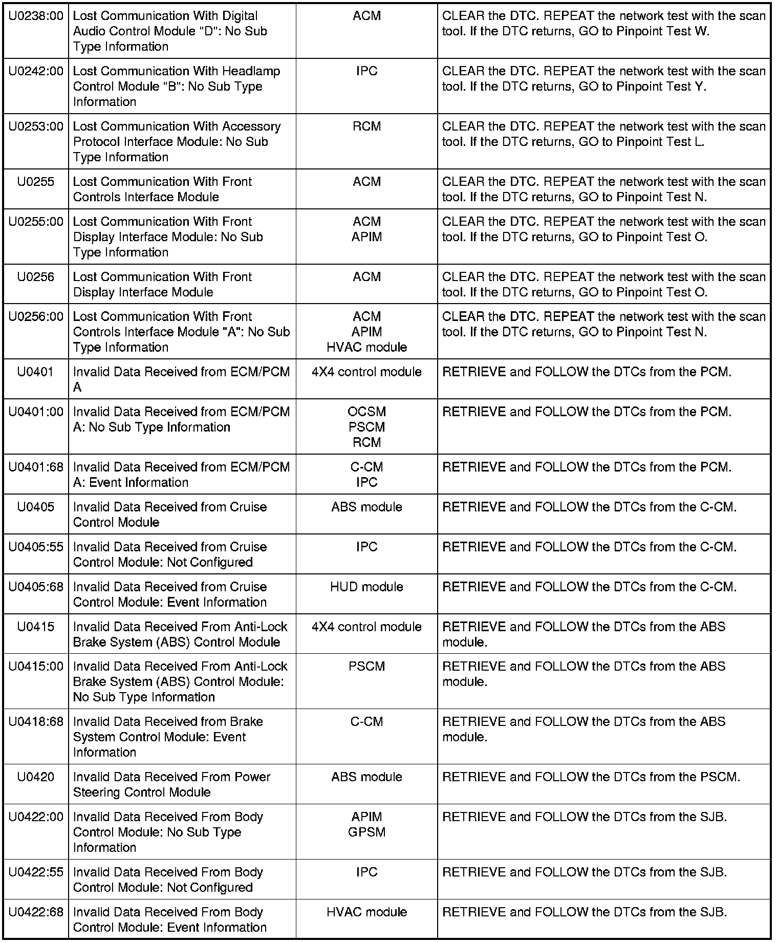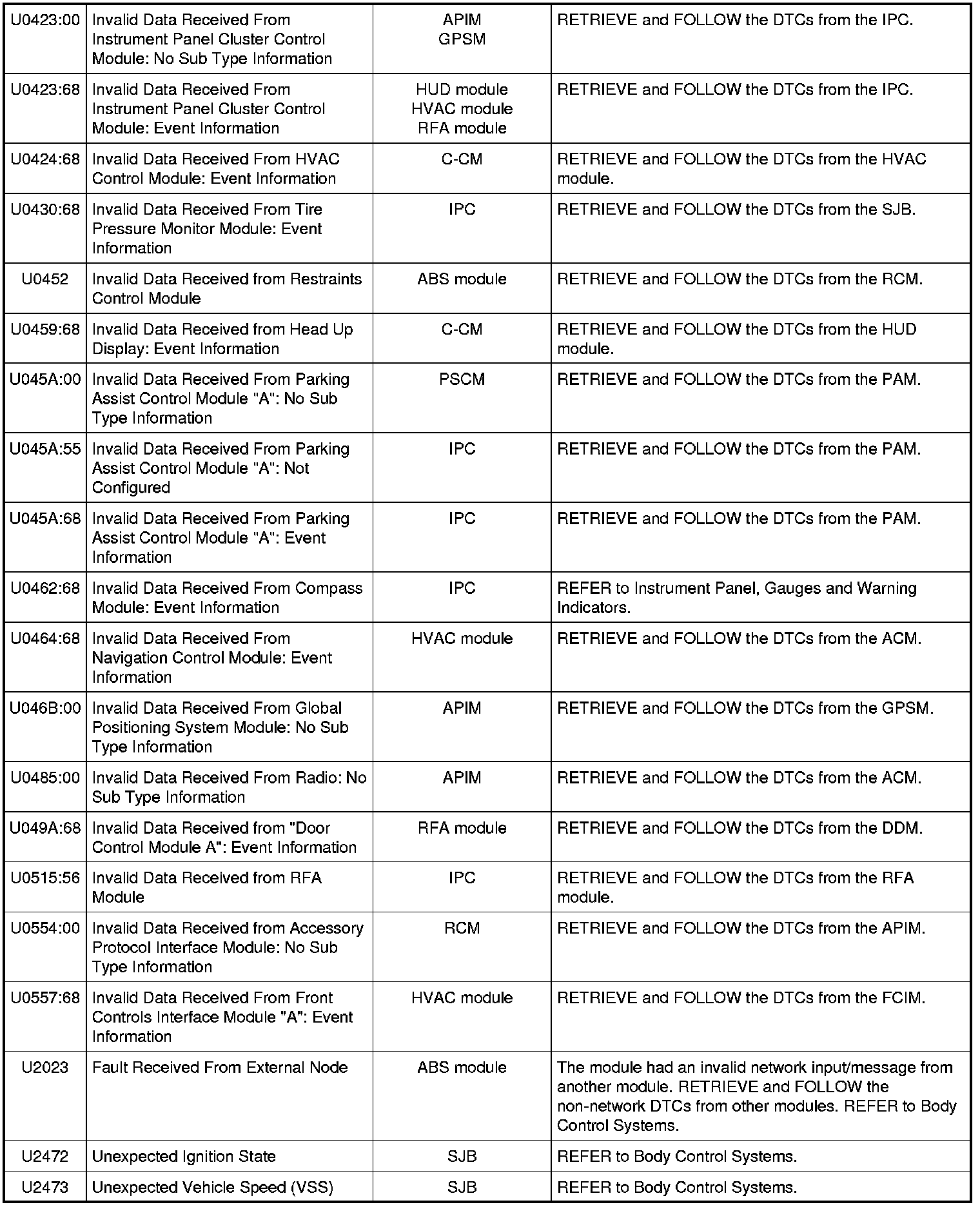 NOTE: Network DTCs (U-codes) are often a result of intermittent concerns such as damaged wiring or low battery voltage occurrences. Additionally, vehicle repair procedures such as module reprogramming often sets network DTCs. Replacing a module to resolve a network DTC is unlikely to resolve the concern. To prevent repeat network DTC concerns, inspect all network wiring, especially connectors. Test the vehicle battery, refer to Battery.