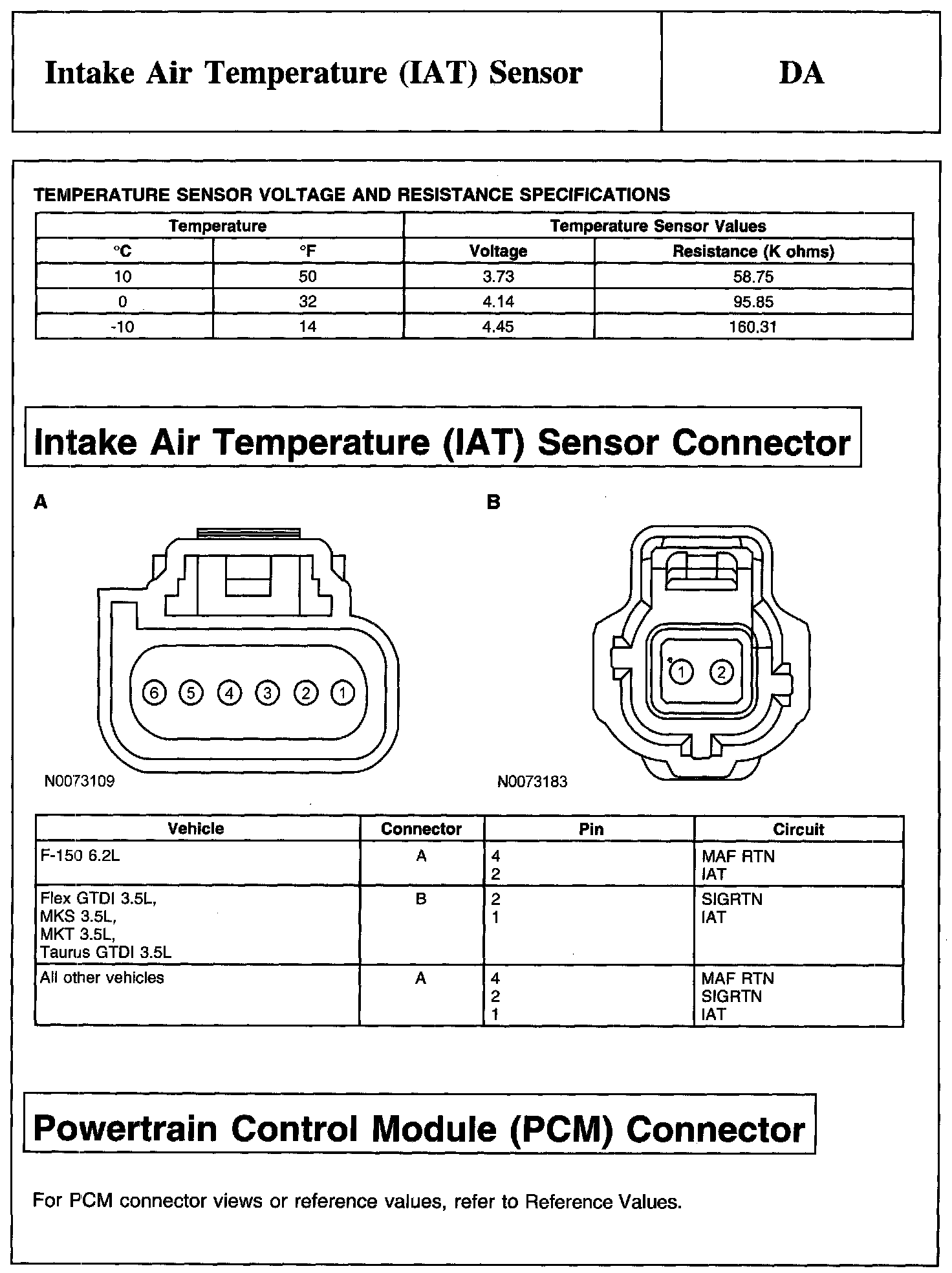 Home >> Ford >> 2010 >> Taurus AWD V6-3.5L >> Repair and Diagnosis >> Powertrain Management >> Computers and Control Systems >> Testing and Inspection >> Pinpoint Tests >> Test DA: Intake Air Temperature (IAT) Sensor