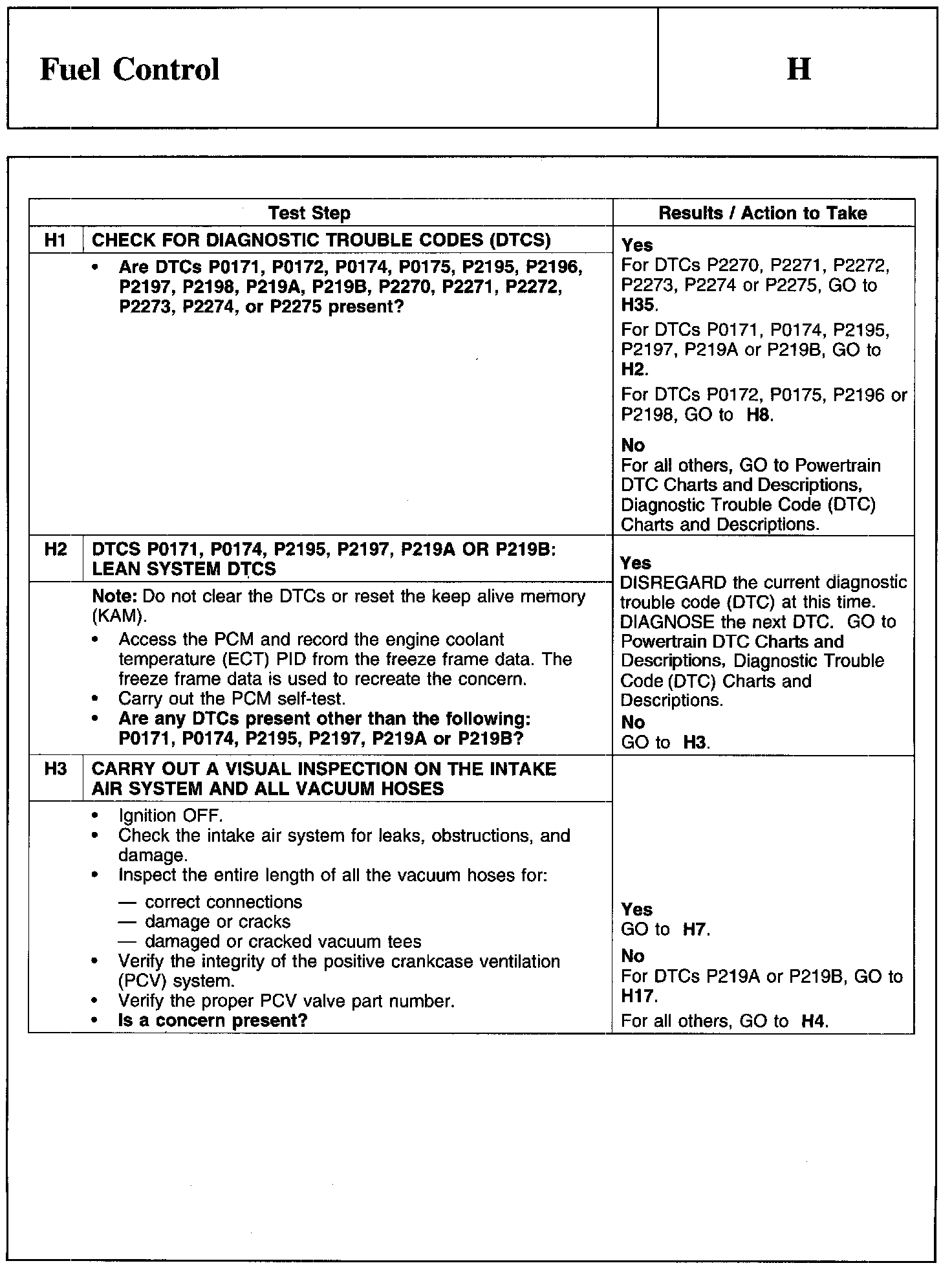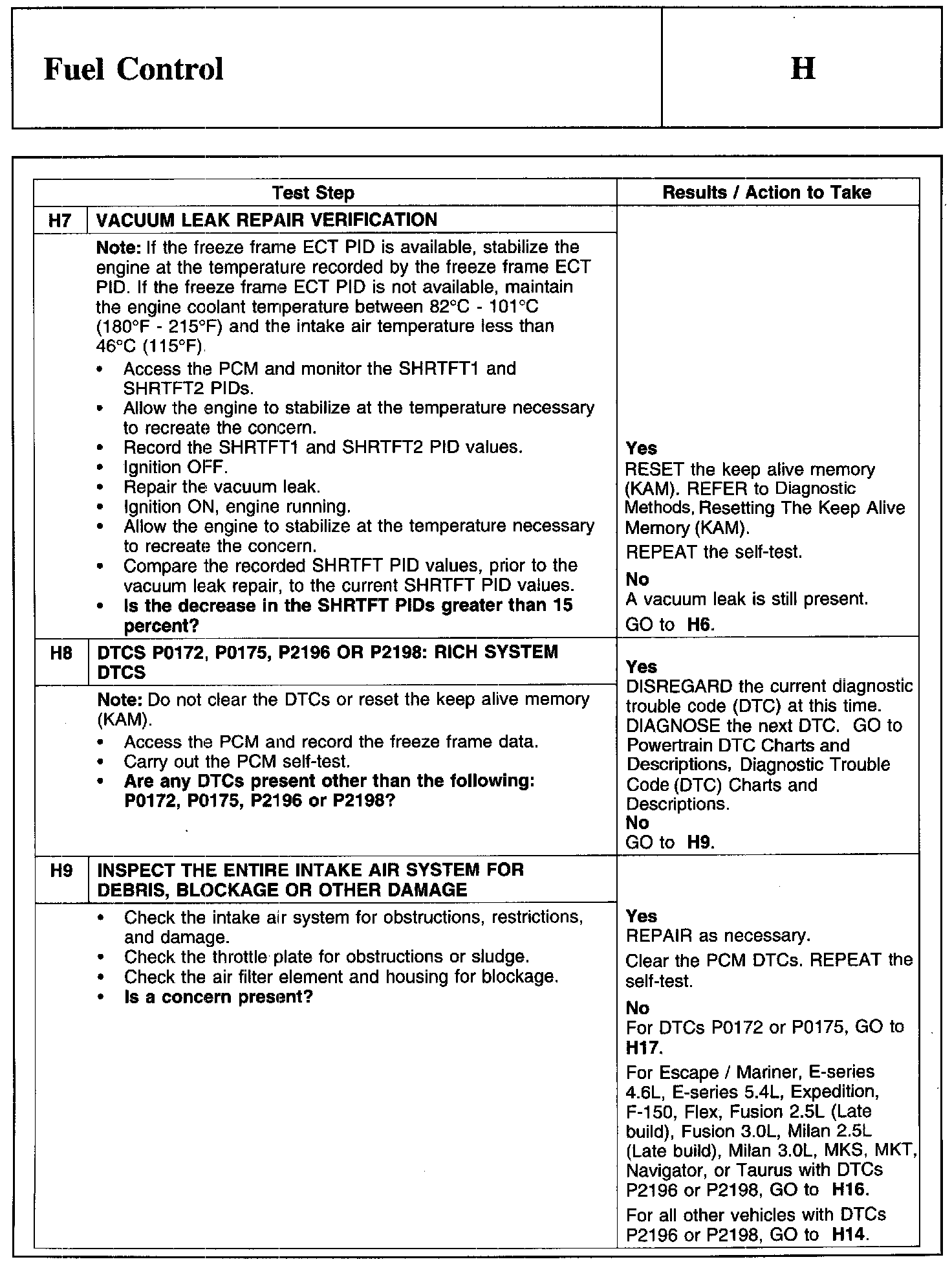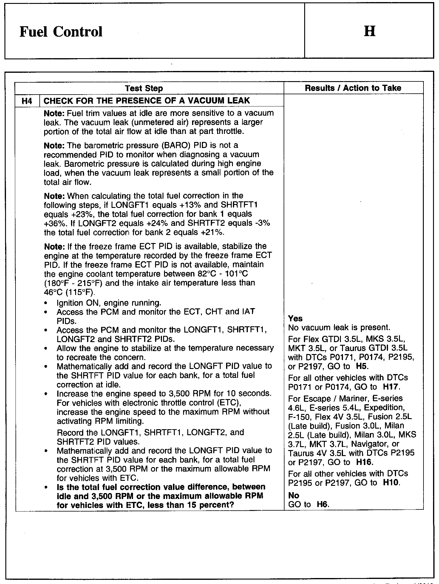 Home >> Ford >> 2010 >> Taurus AWD V6-3.5L >> Repair and Diagnosis >> Powertrain Management >> Computers and Control Systems >> Testing and Inspection >> Pinpoint Tests >> Test H: Fuel Control