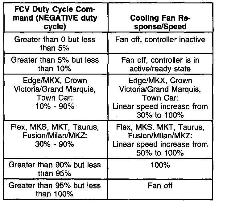 EDGE/MKX, FLEX, MKS, MKT, TAURUS, FUSION/MILAN/MKZ, CROWN VICTORIA/GRAND MARQUIS, TOWN CAR: FCV DUTY CYCLE OUTPUT FROM PCM (negative duty cycle)