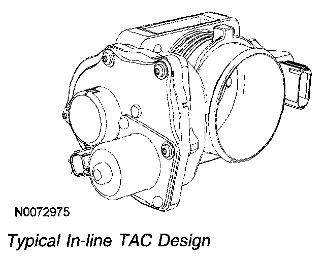 The electronic TAC is a DC motor controlled by the PCM. There are 2 designs for the TAC, parallel and in-line. The parallel design has the motor under the bore parallel to the plate shaft. The motor housing is integrated into the main housing. The in-line design has a separate motor housing. An internal spring is used in both designs to return the throttle plate to a default position. The default position is typically a throttle angle of 7 to 8 degrees from the hard stop angle. The closed throttle plate hard stop is used to prevent the throttle from binding in the bore. This hard stop setting is not adjustable and is set to result in less airflow than the minimum engine airflow required at idle. For additional information, refer to Torque Based Electronic Throttle Control (ETC). Description and Operation