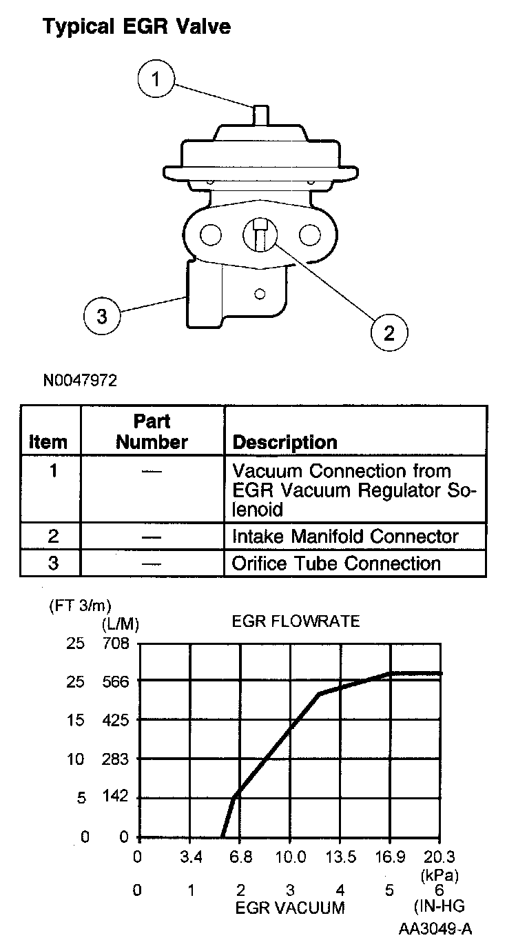The EGR valve in the differential pressure feedback EGR system is a conventional, vacuum-actuated valve. The valve increases or decreases the flow of EGR. As vacuum applied to the EGR valve diaphragm overcomes the spring force, the valve begins to open. As the vacuum signal weakens, at 5.4 kPa (1.6 in-Hg) or less, the spring force closes the valve. The EGR valve is fully open at about 15 kPa (4.4 in-Hg).