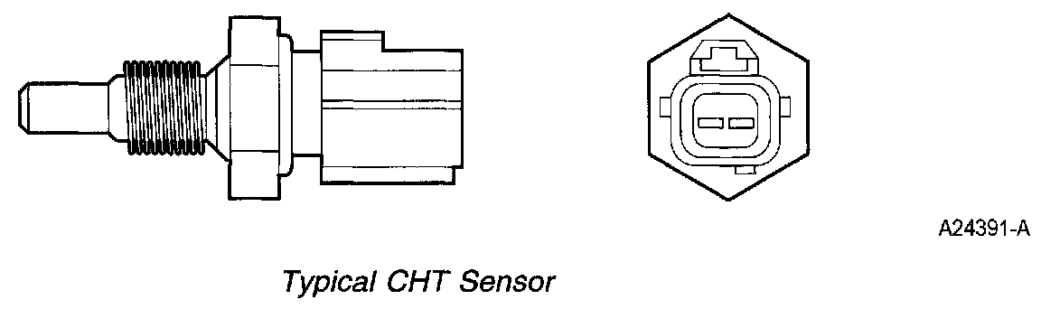 The CHT sensor is a thermistor device in which resistance changes with the temperature. The electrical resistance of a thermistor decreases as temperature increases, and the resistance increases as the temperature decreases. The varying resistance affects the voltage drop across the sensor terminals and provides electrical signals to the PCM corresponding to temperature.