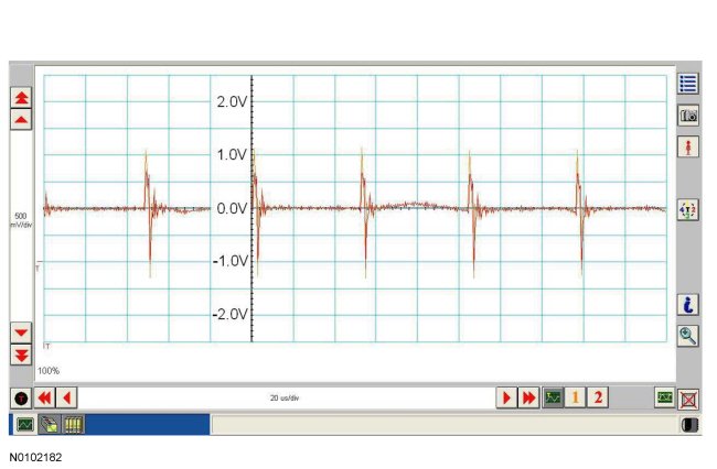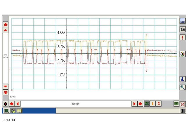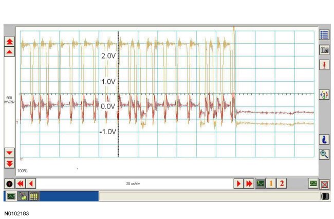 NOTE: The oscilloscope traces below are from the Integrated Diagnostic System (IDS) oscilloscope taken using the IDS pre-configured CAN settings. The traces are for both data (+) and data (-) taken simultaneously (2-channel) at a sample rate of 1 mega-sample per second (1MS/s) or greater. Traces below are viewed at 500mV per division (vertical axis) and 20 microseconds (20�s) per division (horizontal axis). Readings taken with a different oscilloscope vary from those shown. Compare any suspect readings to a known good vehicle.