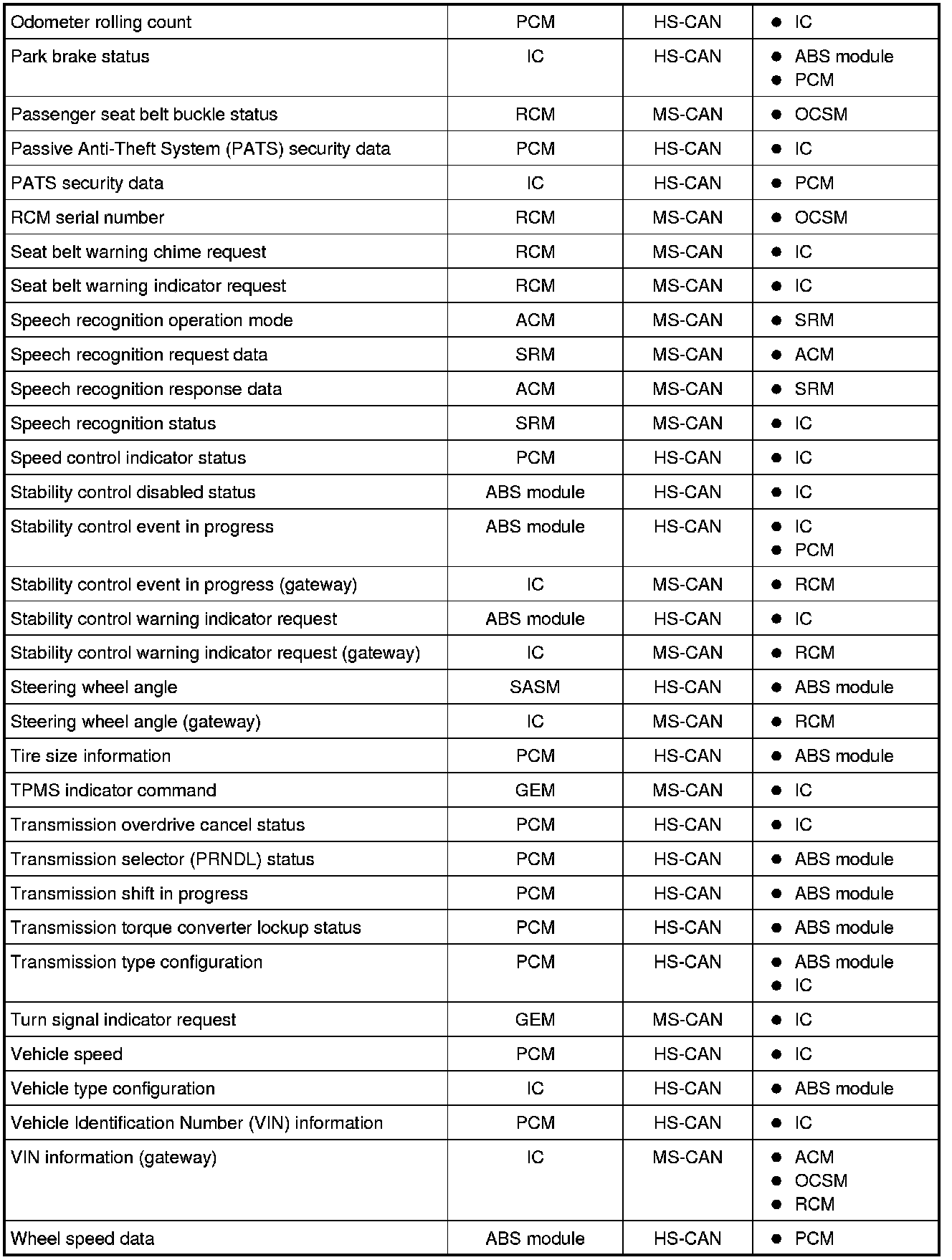 NOTE: This chart describes the specific HS-CAN and MS-CAN messages broadcast by each module, and the module(s) that receive the message.