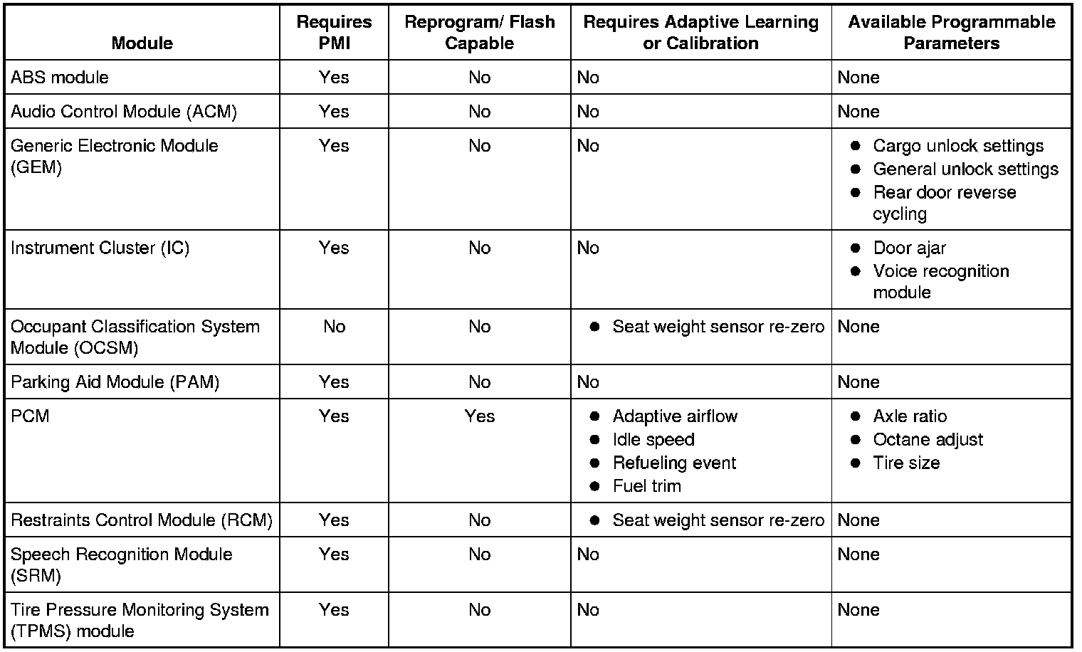 PMI is a scan tool process which configures settings in a new module. Data used for the PMI process is automatically downloaded from the original module and stored when a scan tool session is started. If this data cannot be retrieved from the module being replaced, the scan tool may prompt for As-Built data entry or display a list of parameter values that need to be manually selected. Some modules are reprogrammed during PMI when a strategy/calibration update is available. To carry out PMI, refer to Programmable Module Installation (PMI) Programming and Relearning.