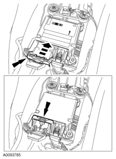- NOTICE: Do not push the connector to where the lever pivots and seats itself. Light pressure is needed to get the connector into position on the Restraints Control Module (RCM) before using the lever to fully seat the connector.