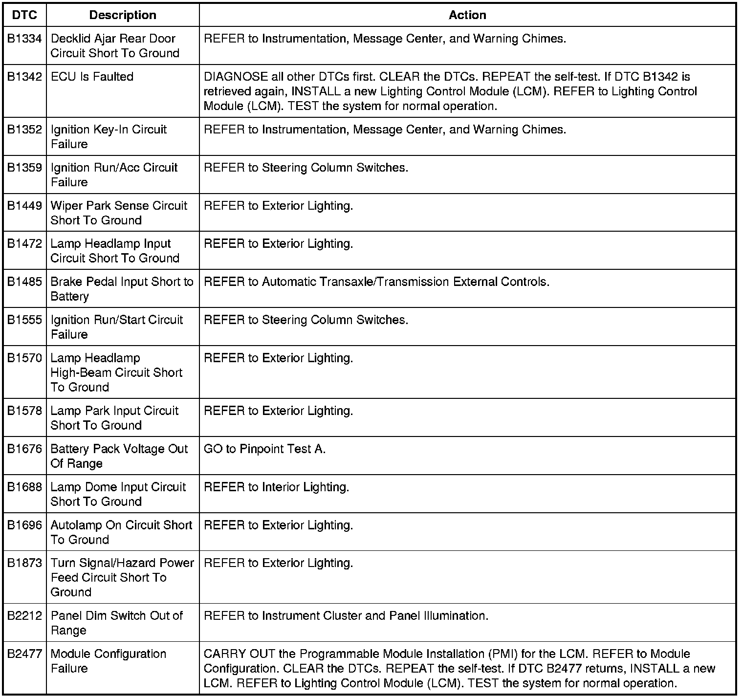 Lighting Control Module (LCM) DTC Chart