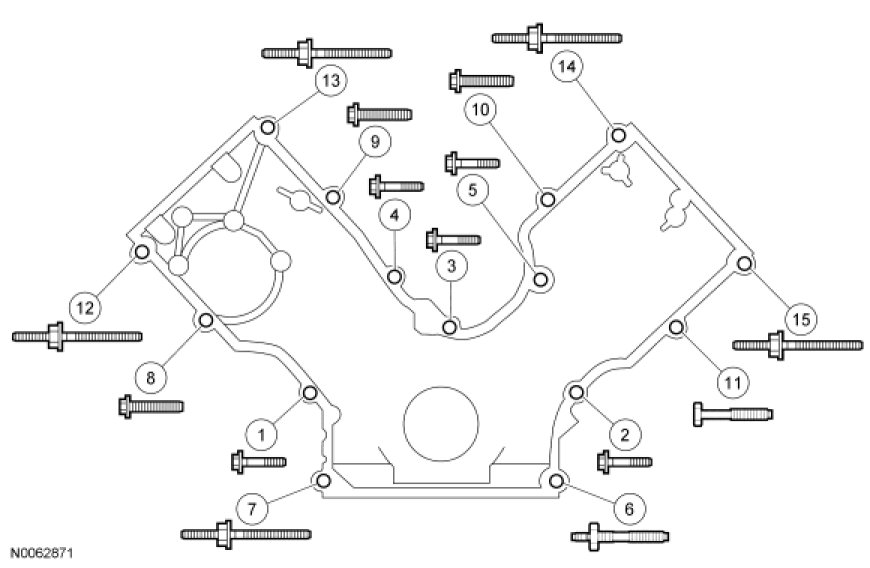 Tighten the 15 engine front cover fasteners in the sequence shown to