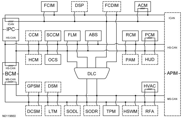 The Instrument Panel Cluster (IPC) and Body Control Module (BCM) are gateway modules. The IPC (Instrument Panel Cluster) translates messages on the HS-CAN (High Speed Controller Area Network) to the I-CAN (Infotainment Controller Area Network) and vice versa. The BCM (Body Control Module) translates messages on the HS-CAN (High Speed Controller Area Network) to the MS-CAN (Medium Speed Controller Area Network) and vice versa. This allows a message to be distributed throughout all three networks.