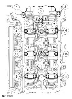 Tighten the 4 camshaft caps bolts in the sequence shown.