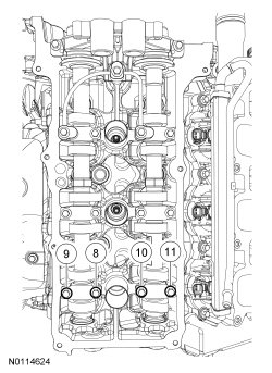 Tighten bolts 8, 9, 10 and 11 to 8 Nm (71 lb-in) then additional 45 degrees.