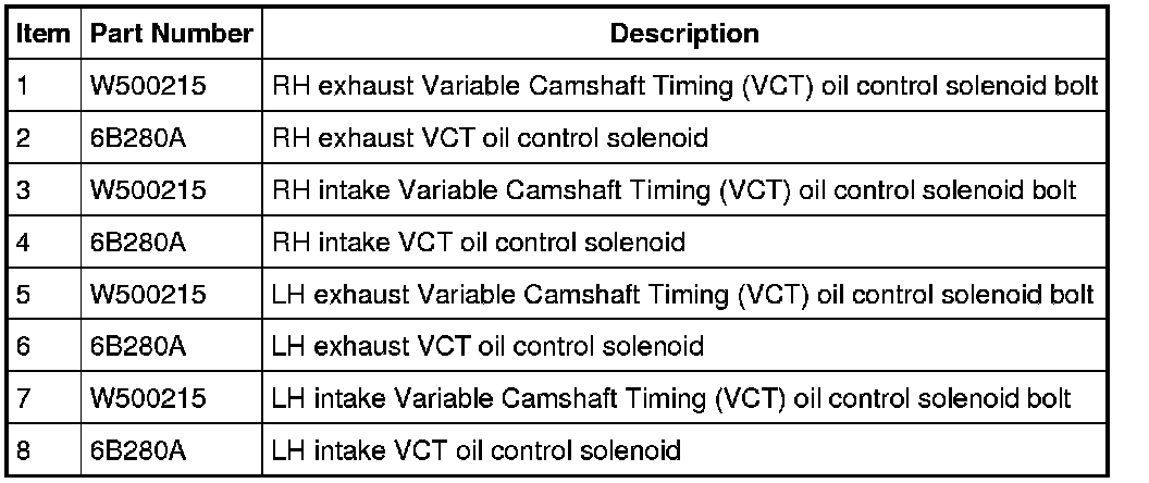 NOTE: The LH and/or RH valve cover must be removed to service the Variable Camshaft Timing (VCT) oil control solenoid. For additional information, refer to Engine Service and Repair.
