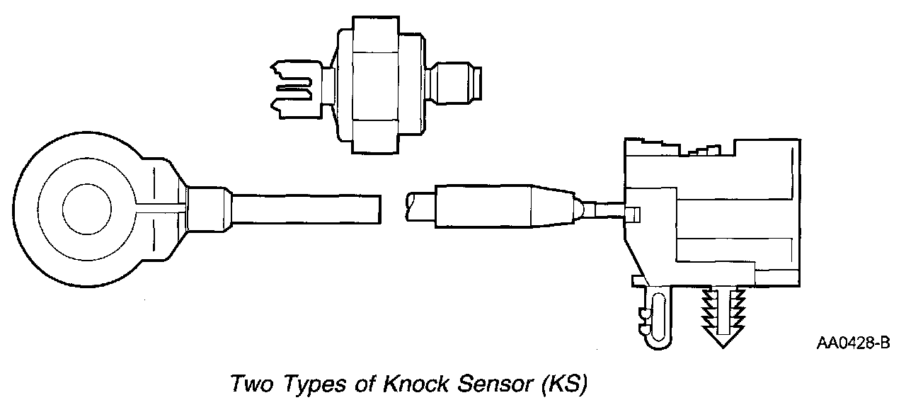 The KS is a tuned accelerometer on the engine which converts engine vibration to an electrical signal. The PCM uses this signal to determine the presence of engine knock and to retard spark timing.