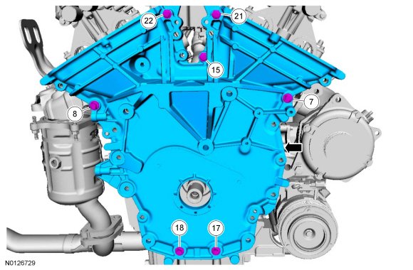 Install the engine front cover and bolts 7, 8, 15, 17, 18, 21 and 22.
