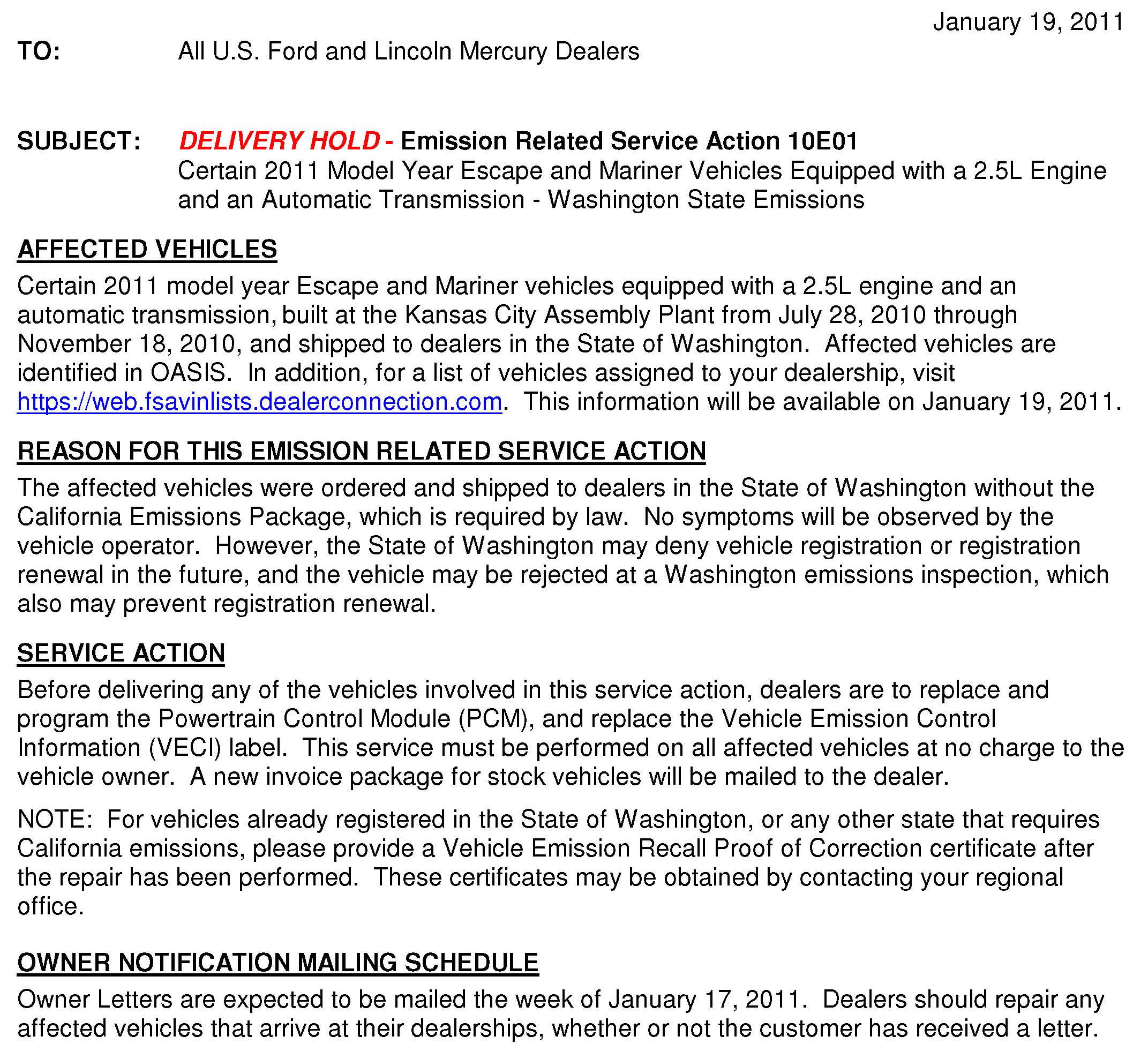 Recall - PCM Replacement/Programming For WA. Emissions