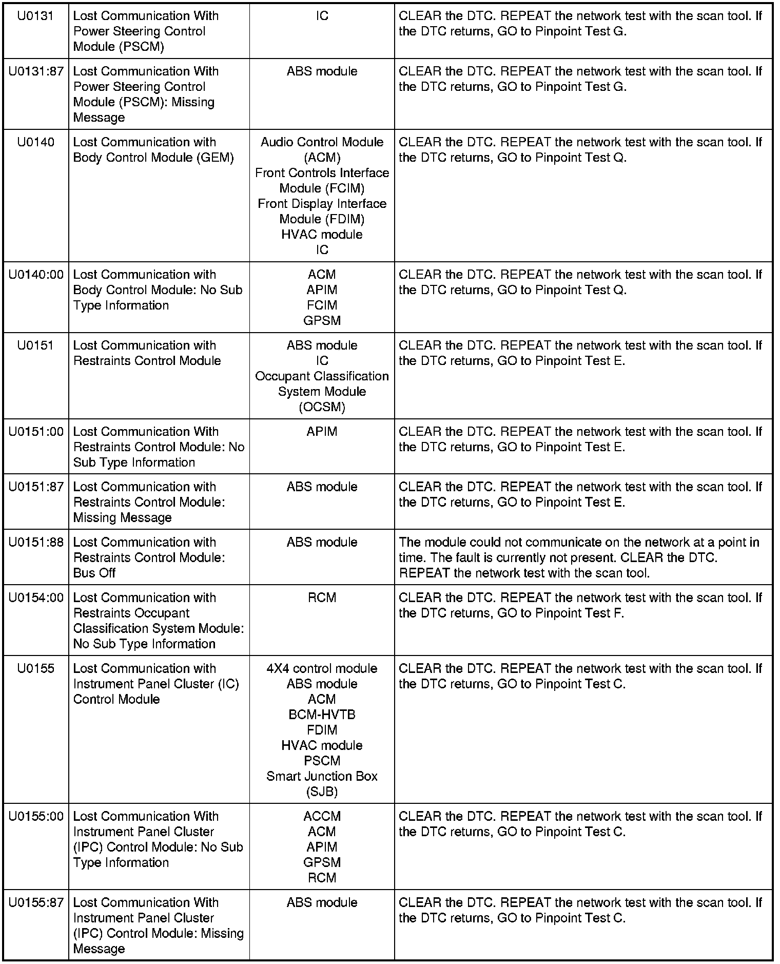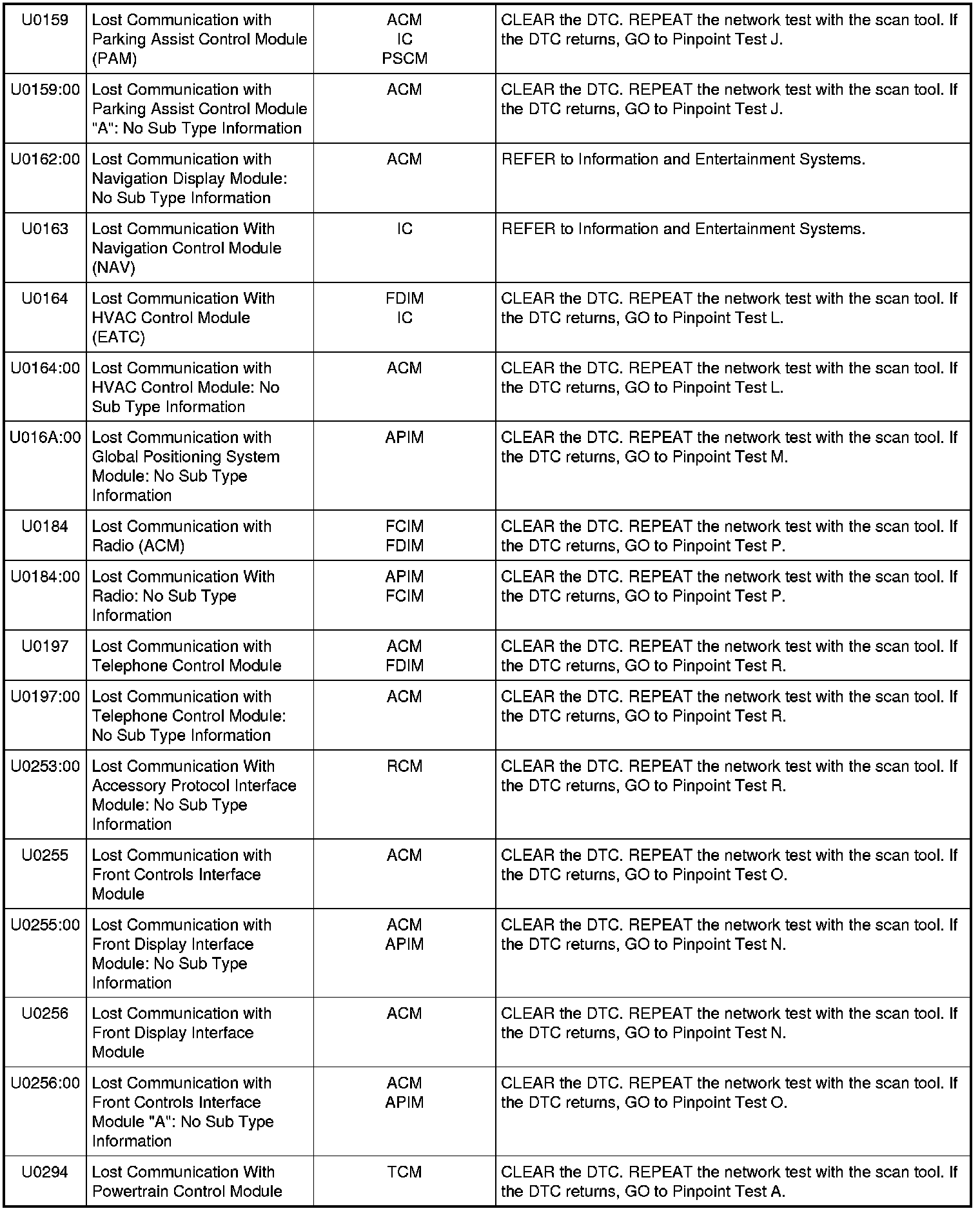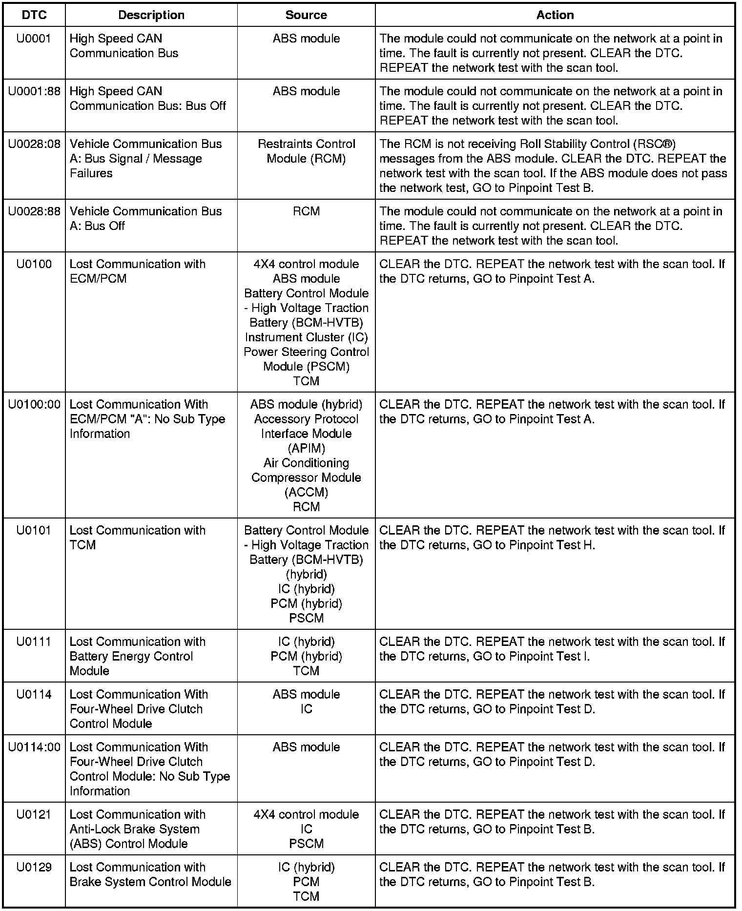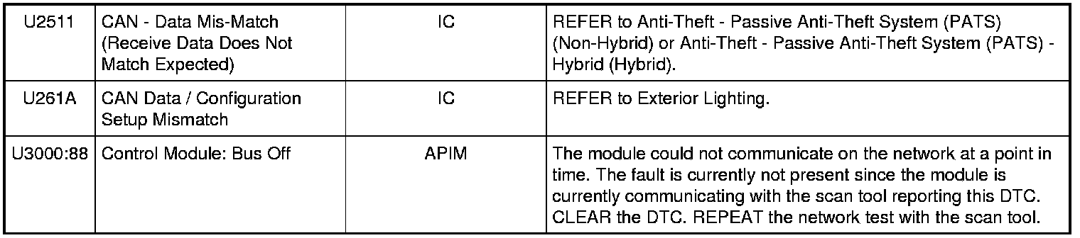 NOTE: Network DTCs (U-codes) are often a result of intermittent concerns such as damaged wiring or low battery voltage occurrences. Additionally, vehicle repair procedures such as module reprogramming often set network DTCs. Replacing a module to resolve a network DTC is unlikely to resolve the concern. To prevent repeat network DTC concerns, inspect all network wiring, especially connectors. Test the vehicle battery, refer to Battery, Mounting and Cables Testing and Inspection.
