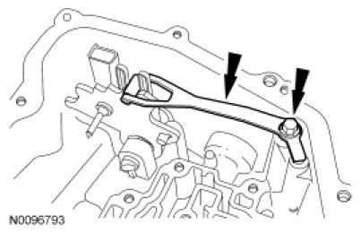 14. Connect the selector lever cable end to the manual control lever with the manual control lever and selector lever in DRIVE. Check selector lever cable adjustment. For additional information, refer to Automatic Transaxle/Transmission External Controls - 6F35 Adjustments.