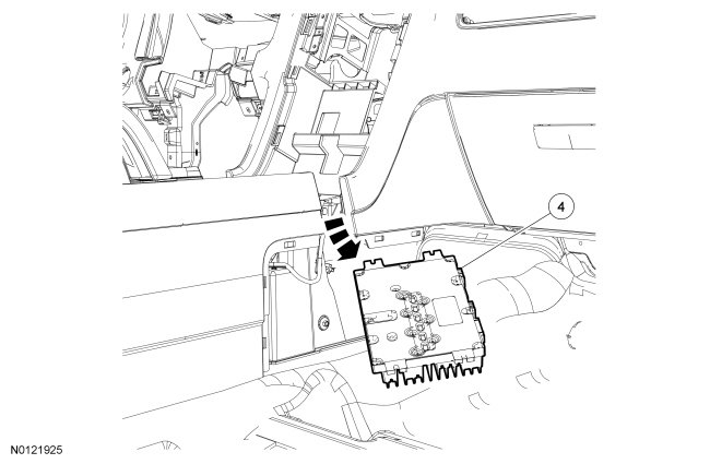 3. Remove the necessary attachments and move the center console 5 cm (2.0 in) towards the rear of the vehicle. For additional information, refer to Instrument Panel and Console Console - Front, Floor Console - Front, Floor.