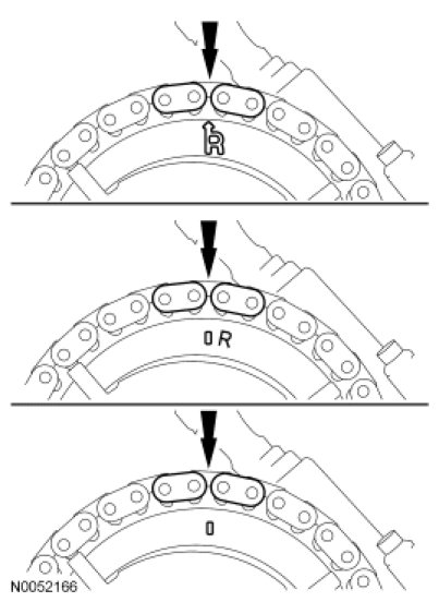 NOTE: The camshaft phaser and sprocket will be stamped with one of the illustrated timing marks for the RH camshaft.