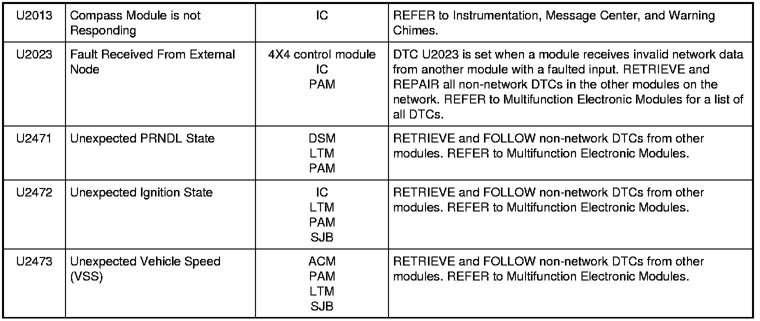 NOTE: Network DTCs (U-codes) are often a result of intermittent concerns such as damaged wiring or low battery voltage occurrences. Additionally, vehicle repair procedures such as module reprogramming often set network DTCs. Replacing a module to resolve a network DTC is unlikely to resolve the concern. To prevent repeat network DTC concerns, inspect all network wiring, especially connectors. Test the vehicle battery, refer to Battery, Mounting and Cables Testing and Inspection.