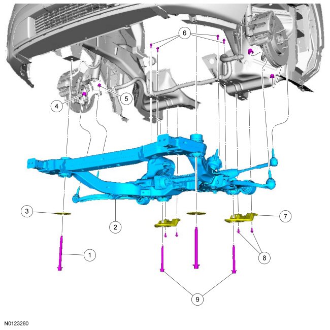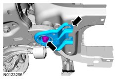 Remove and discard the 2 front subframe forward bolts.