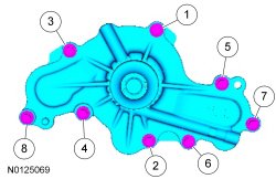 Tighten the coolant pump bolts in the sequence shown in 2 stages.