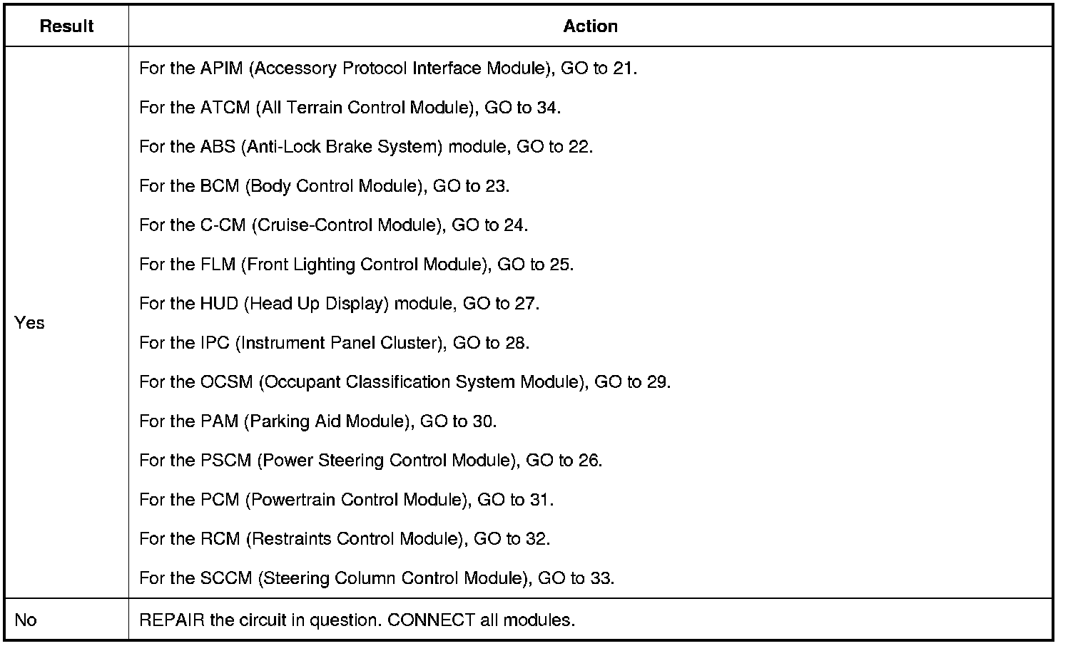 16. CHECK FOR RESTORED COMMUNICATION WITH THE SCCM (Steering Column Control Module), ATCM (All Terrain Control Module), FLM (Front Lighting Control Module) AND THE HUD (Head Up Display) MODULE DISCONNECTED
