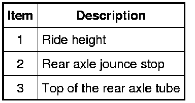 1. Measure the distance between the rear axle jounce stop (Item 2) and the top of the rear axle tube (Item 3) to obtain the rear ride height (Item 1).