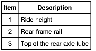 1. Measure the distance between the rear frame rail (Item 2) and the top of the rear axle tube (Item 3) to obtain the rear ride height (Item 1).