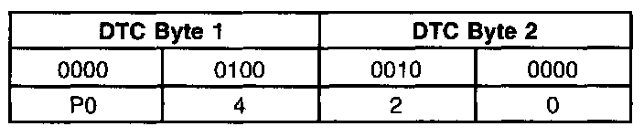 Like all digital signals, DTCs are sent to the scan tool as a series of 1s and 0s. Each DTC is made up of 2 data bytes, each consisting of 8 bits that can be set to 1 or 0. In order to display the DTCs in the conventional format, the data is decoded by the scan tool to display each set of 4 bits as a hexadecimal number (0 to F). For example, P0420 Catalyst System Efficiency Below Threshold (Bank 1).