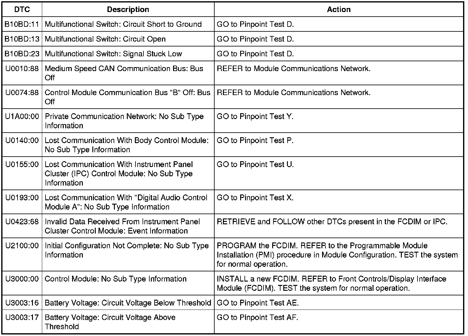 Front Control/Display Interface Module (FCDIM) DTC Chart