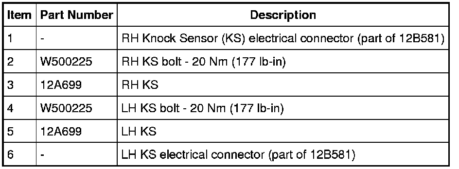 NOTICE: The RH Knock Sensor (KS) must be installed in the 2 o'clock position and the LH KS must be installed in the 11 o'clock position. Failure to follow these instructions may result in damage to the engine.