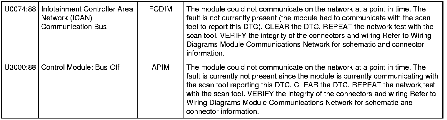 NOTE: Network DTCs (U-codes) are often a result of intermittent concerns such as damaged wiring or low battery voltage occurrences. Additionally, repair procedures such as module reprogramming often set network DTCs. Replacing a module to resolve a network DTC is unlikely to correct the concern. To prevent repeat network DTC concerns, inspect all network wiring, especially connectors. Test the vehicle battery, refer to Battery, Mounting and Cables Testing and Inspection.