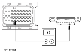 - Measure the resistance between the TCM C1750A-35, circuit VDB05 (WH), harness side and the DLC C251-14, circuit VDB05 (WH), harness side.