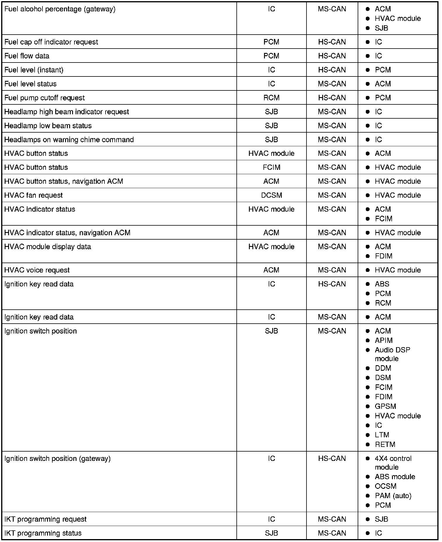 NOTE: This chart describes the specific HS-CAN and MS-CAN messages broadcast by each module, and the module(s) that receive the message.