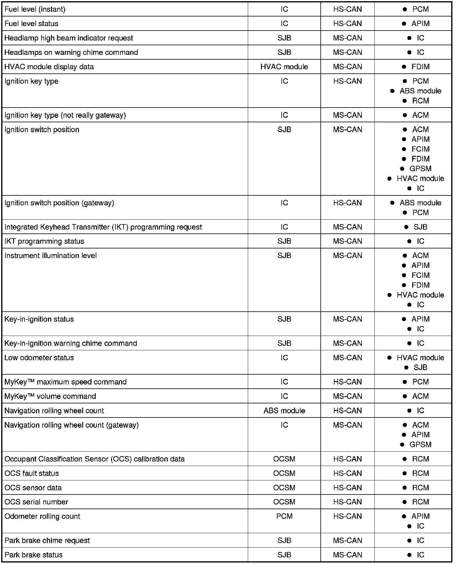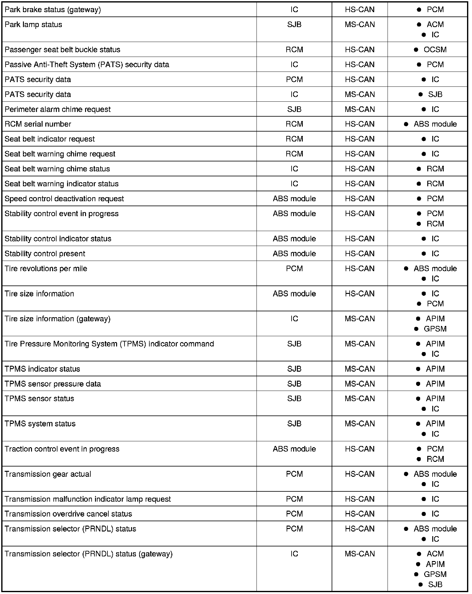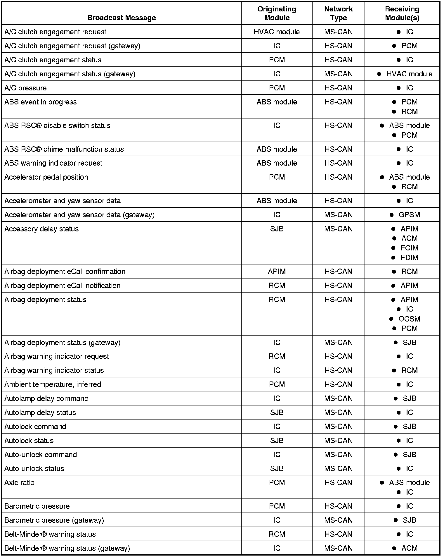 NOTE: This chart describes the specific HS-CAN and MS-CAN messages broadcast by each module, and the module(s) that receive the message.