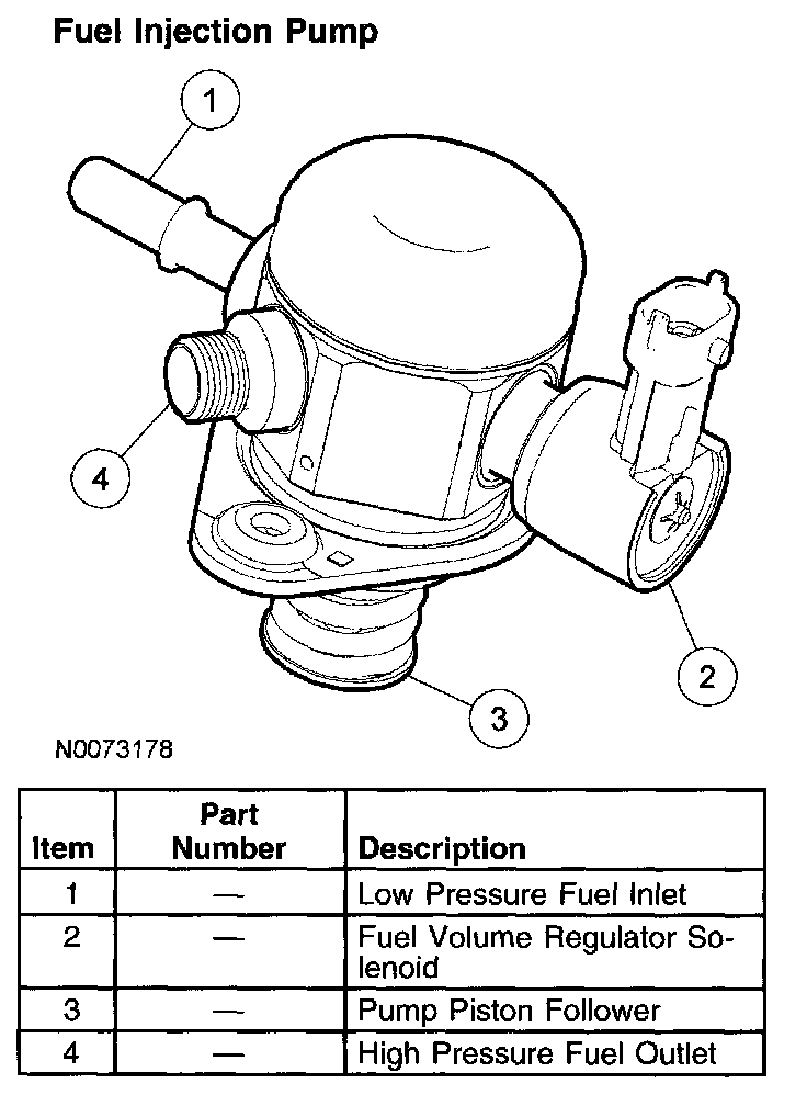 The engine driven fuel injection pump increases fuel rail pressure to the desired level to support fuel injection requirements. Unlike conventional port fuel injection systems, with direct injection the desired fuel rail pressure ranges widely over operating conditions. The pump receives fuel from the fuel pump (FP) assembly, increases the fuel pressure from approximately 448 kPa (65 psi) to a variable pressure up to 15 MPa (2175 psi), and delivers it to the fuel rails. The fuel injection pump is driven by a dedicated intake camshaft lobe and is located on top of the engine.
