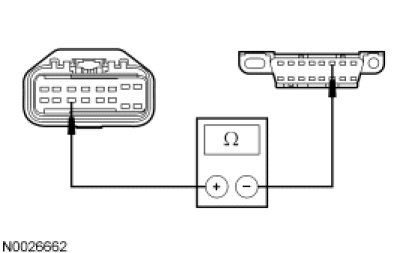 - Measure the resistance between the TCM C1533-14, circuit VDB04 (WH/BU), harness side and the DLC C251-6, circuit VDB04 (WH/BU), harness side.