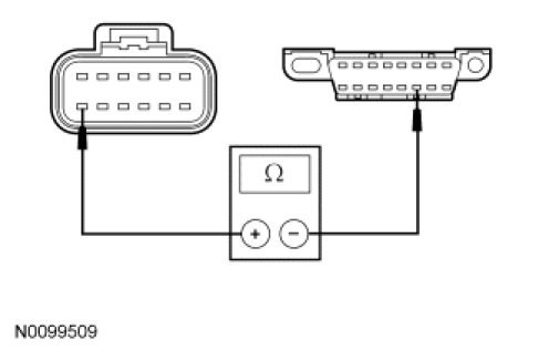 - Measure the resistance between the TCM C1458a-1, circuit VDB04 (WH/BU), harness side and the DLC C251-6, circuit VDB04 (WH/BU), harness side.
