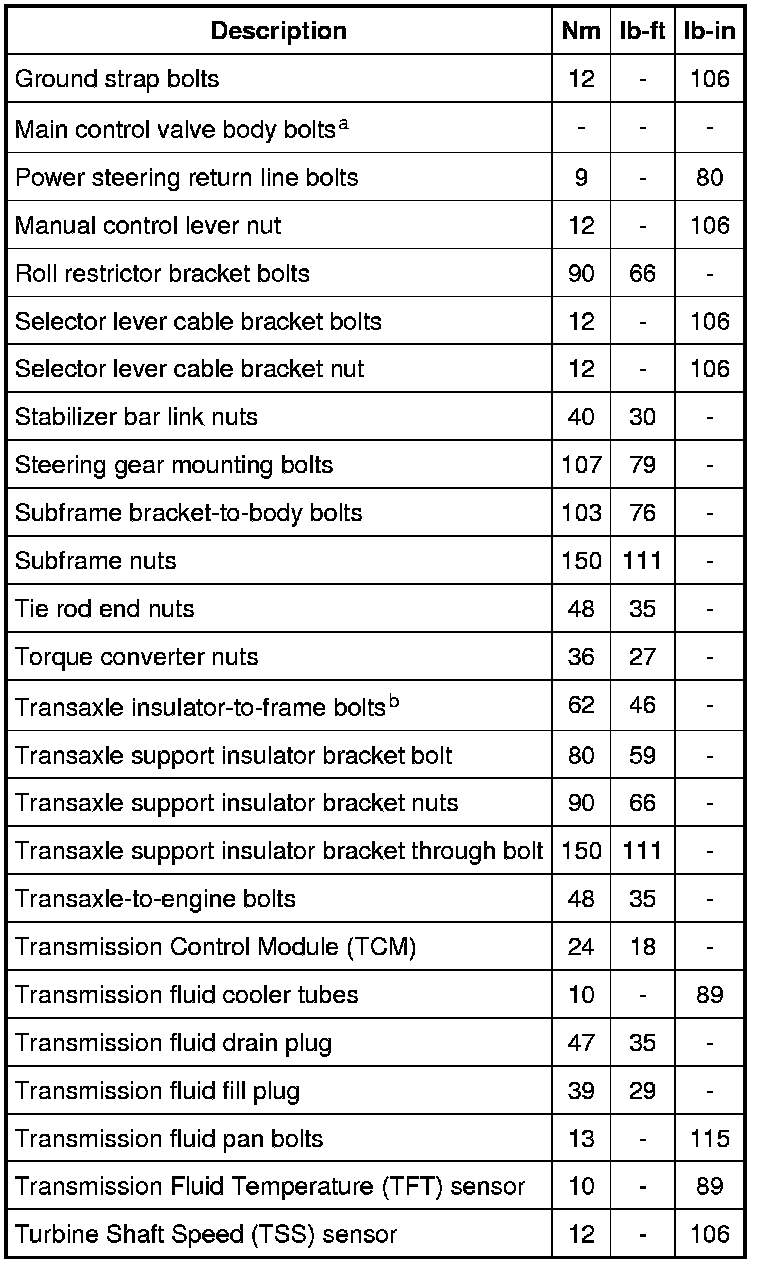 Home >> Ford >> 2011 >> Fusion FWD L4-2.5L >> Repair and Diagnosis >> Specifications >> Mechanical Specifications >> Automatic Transmission/Transaxle >> System Specifications >> Aisin AW21 >> Torque Specifications