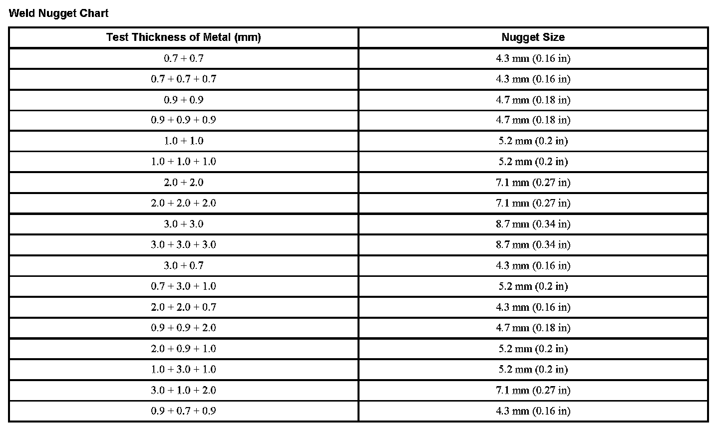 Weld Nugget Chart: