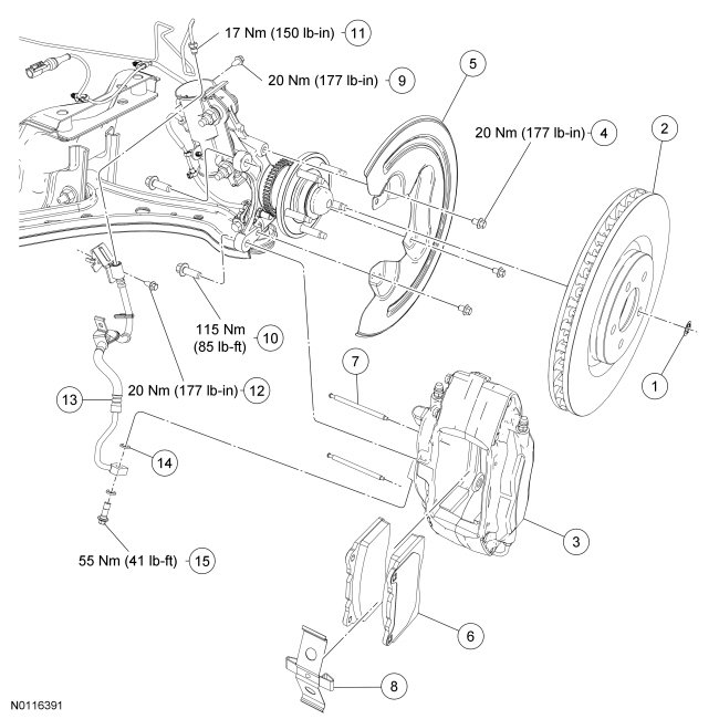 1. NOTE: A revised part, with the same base part number, has been released for the RH brake hose. When installing a new RH brake hose, position the anti-rotation tab on the mounting bracket toward the front of the vehicle and install the bolt with the head toward the rear of the vehicle.