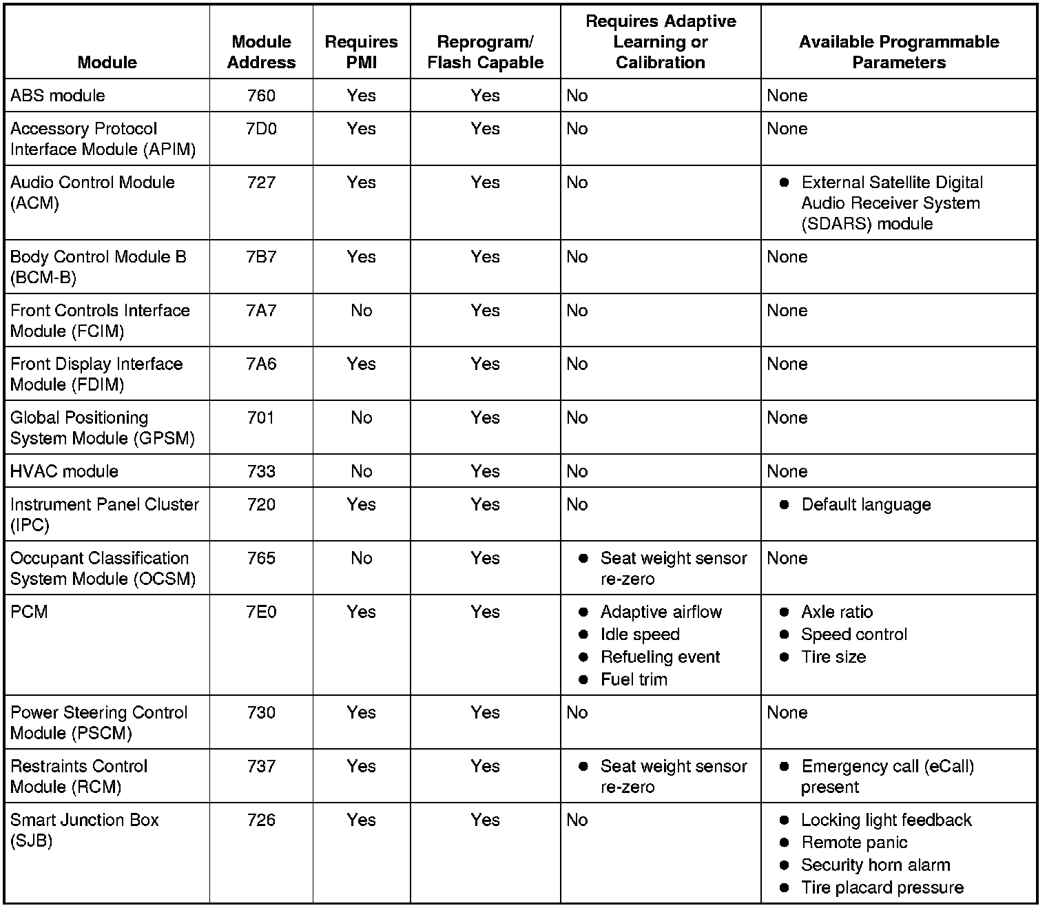 PMI is a scan tool process which configures settings in a new module. Data used for the PMI process is automatically downloaded from the original module and stored when a scan tool session is started. If this data cannot be retrieved from the module being replaced, the scan tool may prompt for As-Built data entry or display a list of parameter values that need to be manually selected. Some modules are reprogrammed during PMI when a strategy/calibration update is available. To carry out PMI, refer to Programmable Module Installation (PMI) Programmable Module Installation (PMI).
