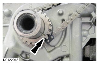 Align the colored link on the timing chain with the timing mark on the LH VCT assembly.
