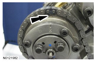 The timing mark on the intake VCT assembly should align between the 2 consecutive colored links.